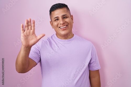 Young hispanic man standing over pink background waiving saying hello happy and smiling, friendly welcome gesture