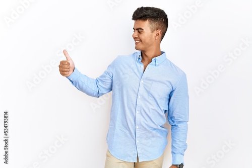 Young hispanic man wearing business shirt standing over isolated background looking proud, smiling doing thumbs up gesture to the side