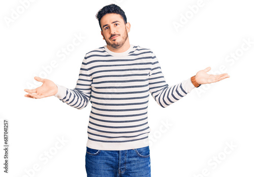 Young hispanic man wearing casual clothes clueless and confused with open arms, no idea concept.