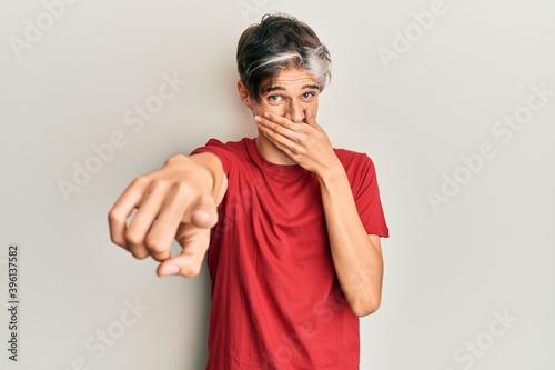 Young hispanic man wearing casual clothes laughing at you, pointing finger to the camera with hand over mouth, shame expression