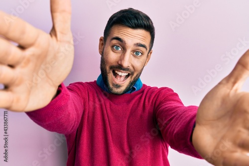 Young hispanic man wearing casual clothes looking at the camera smiling with open arms for hug. cheerful expression embracing happiness.