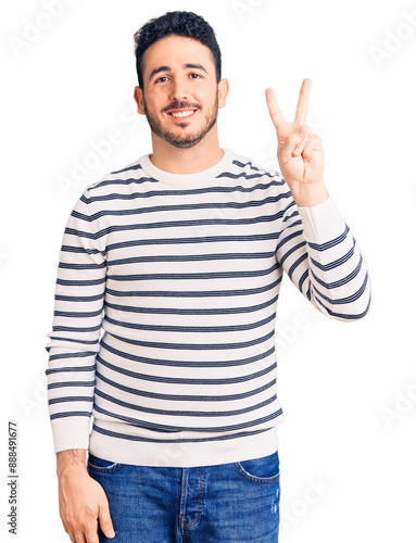 Young hispanic man wearing casual clothes showing and pointing up with fingers number two while smiling confident and happy.