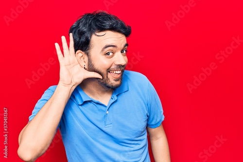 Young hispanic man wearing casual clothes smiling with hand over ear listening and hearing to rumor or gossip. deafness concept.