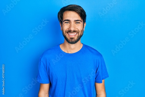 Young hispanic man wearing casual clothes with a happy and cool smile on face. lucky person.
