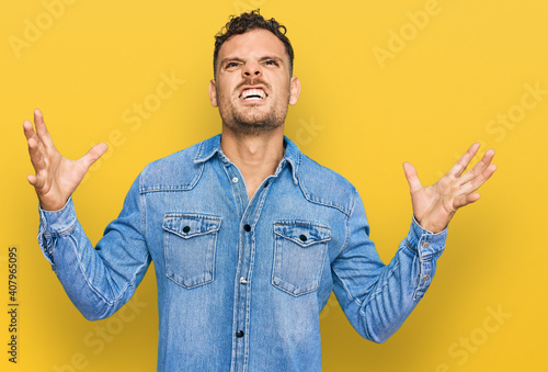 Young hispanic man wearing casual denim jacket crazy and mad shouting and yelling with aggressive expression and arms raised. frustration concept.