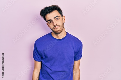Young hispanic man wearing casual t shirt looking sleepy and tired, exhausted for fatigue and hangover, lazy eyes in the morning.