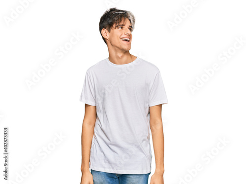 Young hispanic man wearing casual white tshirt looking away to side with smile on face, natural expression. laughing confident.