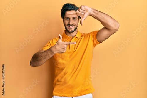 Young hispanic man wearing casual yellow t shirt smiling making frame with hands and fingers with happy face. creativity and photography concept.