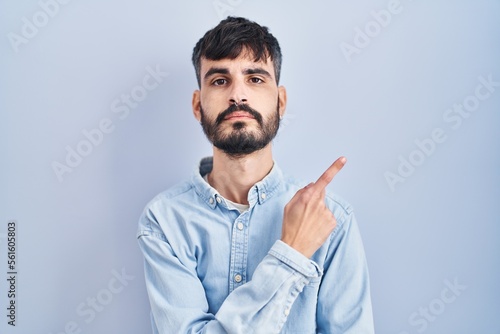 Young hispanic man with beard standing over blue background pointing with hand finger to the side showing advertisement, serious and calm face