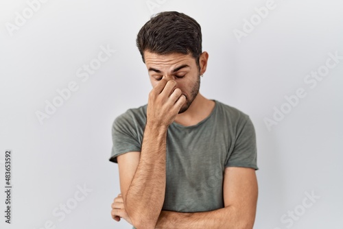 Young hispanic man with beard wearing casual t shirt over white background tired rubbing nose and eyes feeling fatigue and headache. stress and frustration concept.