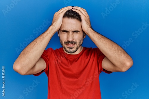 Young hispanic man with beard wearing red t shirt over blue background suffering from headache desperate and stressed because pain and migraine. hands on head.