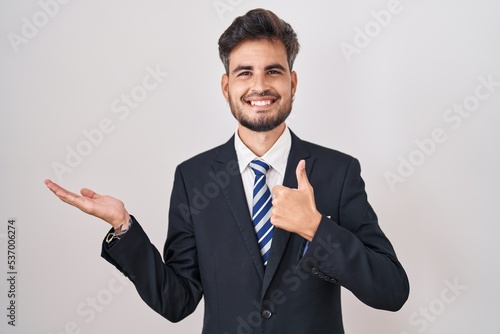 Young hispanic man with tattoos wearing business suit and tie showing palm hand and doing ok gesture with thumbs up, smiling happy and cheerful