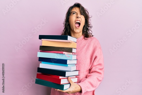 Young hispanic woman holding a pile of books angry and mad screaming frustrated and furious, shouting with anger looking up.