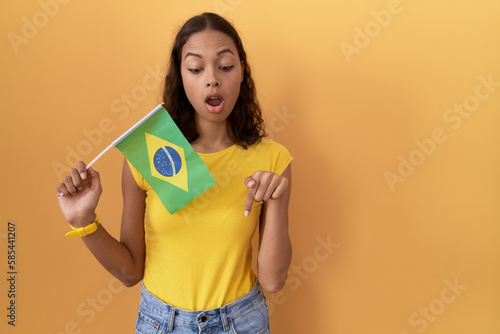 Young hispanic woman holding brazil flag pointing down with fingers showing advertisement, surprised face and open mouth