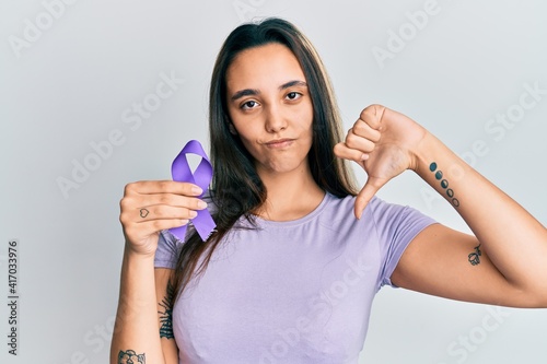 Young hispanic woman holding purple ribbon awareness with angry face, negative sign showing dislike with thumbs down, rejection concept