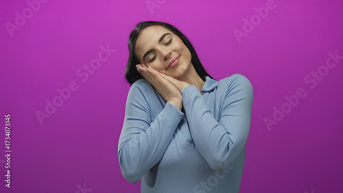 Young hispanic woman in blue shirt gesturing sleep against vibrant pink wall background for calm emotion expression