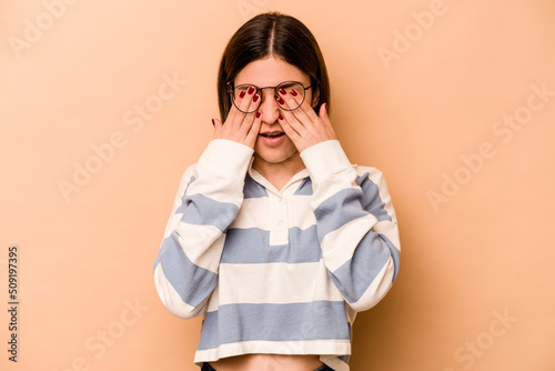 Young hispanic woman isolated on beige background afraid covering eyes with hands.