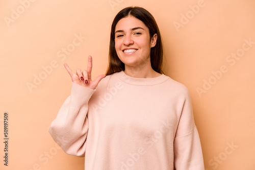 Young hispanic woman isolated on beige background showing a horns gesture as a revolution concept.