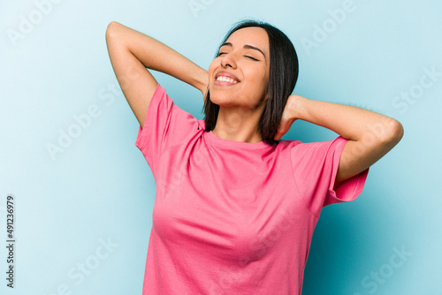 Young hispanic woman isolated on blue background feeling confident, with hands behind the head.