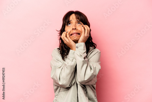 Young hispanic woman isolated on pink background crying, unhappy with something, agony and confusion concept.