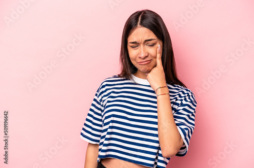 Young hispanic woman isolated on pink background crying, unhappy with something, agony and confusion concept.
