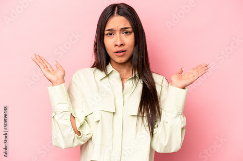 Young hispanic woman isolated on pink background having an idea, inspiration concept.
