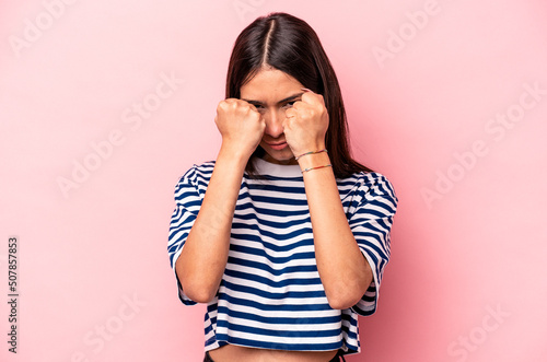 Young hispanic woman isolated on pink background throwing a punch, anger, fighting due to an argument, boxing.