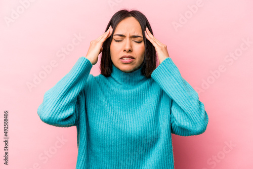 Young hispanic woman isolated on pink background touching temples and having headache.