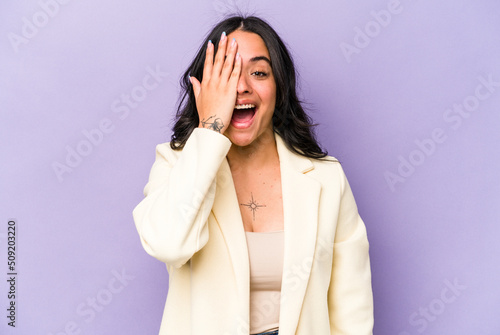 Young hispanic woman isolated on purple background having fun covering half of face with palm.