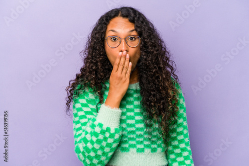 Young hispanic woman isolated on purple background shocked, covering mouth with hands, anxious to discover something new.