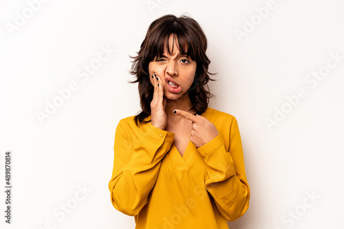 Young hispanic woman isolated on white background having a strong teeth pain, molar ache.