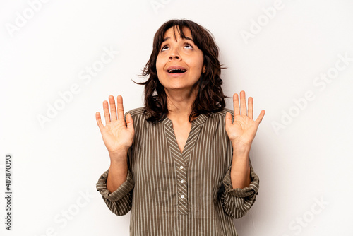 Young hispanic woman isolated on white background screaming to the sky, looking up, frustrated.