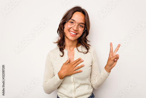 Young hispanic woman isolated on white background taking an oath, putting hand on chest.