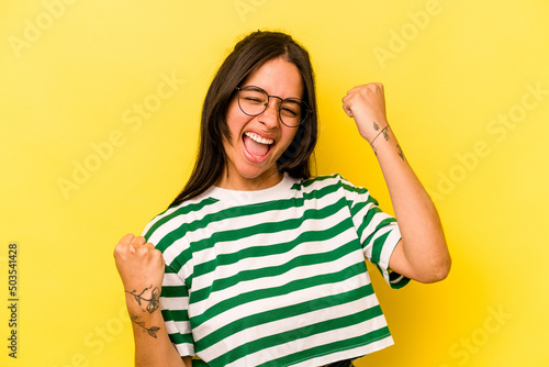 Young hispanic woman isolated on yellow background cheering carefree and excited. Victory concept.