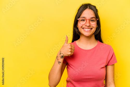 Young hispanic woman isolated on yellow background smiling and raising thumb up