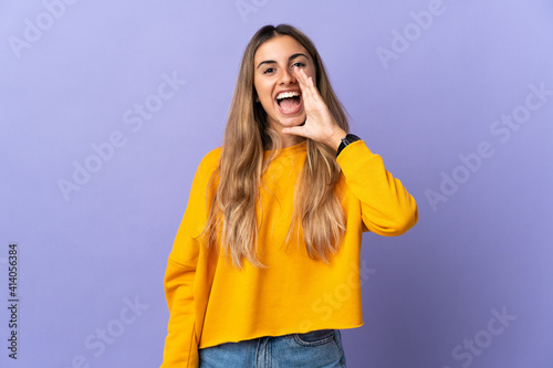 Young hispanic woman over isolated purple background shouting with mouth wide open