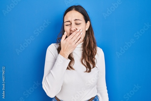 Young hispanic woman standing over blue background bored yawning tired covering mouth with hand. restless and sleepiness.