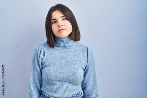 Young hispanic woman standing over blue background relaxed with serious expression on face. simple and natural looking at the camera.