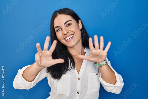Young hispanic woman standing over blue background showing and pointing up with fingers number nine while smiling confident and happy.