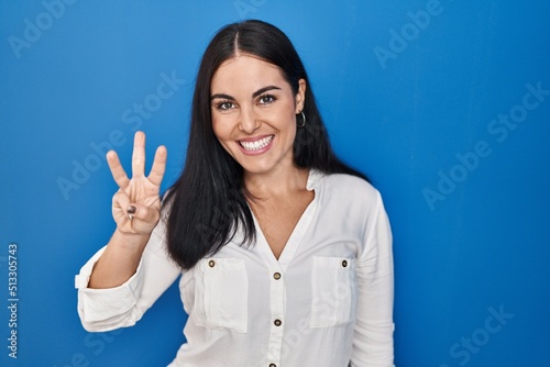 Young hispanic woman standing over blue background showing and pointing up with fingers number three while smiling confident and happy.