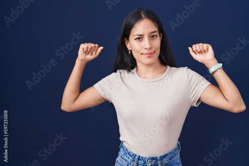 Young hispanic woman standing over blue background showing arms muscles smiling proud. fitness concept.