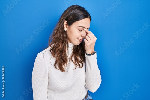 Young hispanic woman standing over blue background tired rubbing nose and eyes feeling fatigue and headache. stress and frustration concept.