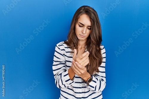 Young hispanic woman standing over blue isolated background suffering pain on hands and fingers, arthritis inflammation