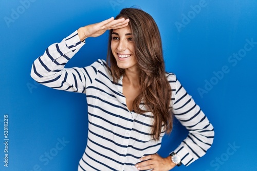 Young hispanic woman standing over blue isolated background very happy and smiling looking far away with hand over head. searching concept.