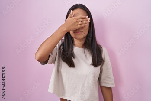 Young hispanic woman standing over pink background covering eyes with hand, looking serious and sad. sightless, hiding and rejection concept
