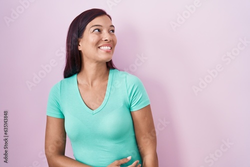 Young hispanic woman standing over pink background looking away to side with smile on face, natural expression. laughing confident.