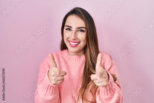 Young hispanic woman standing over pink background pointing fingers to camera with happy and funny face. good energy and vibes.