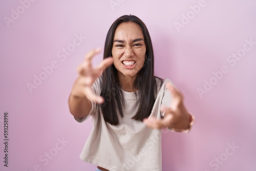 Young hispanic woman standing over pink background shouting frustrated with rage, hands trying to strangle, yelling mad