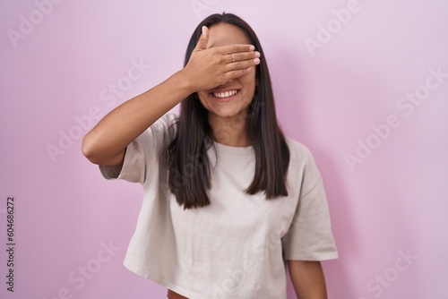 Young hispanic woman standing over pink background smiling and laughing with hand on face covering eyes for surprise. blind concept.