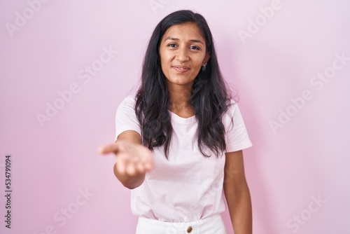 Young hispanic woman standing over pink background smiling cheerful offering palm hand giving assistance and acceptance.